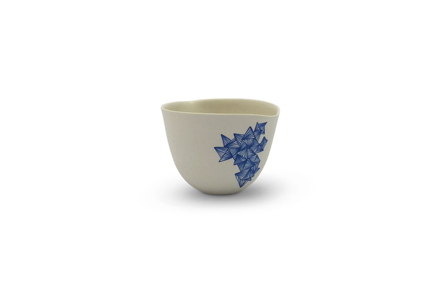 Bol en porcelaine de Limoges tournée. Motifs triangulaires bleus sur une face. Finition mate à l'extérieur et émail satiné à l'intérieur. Série limitée. Vaisselle utilitaire.