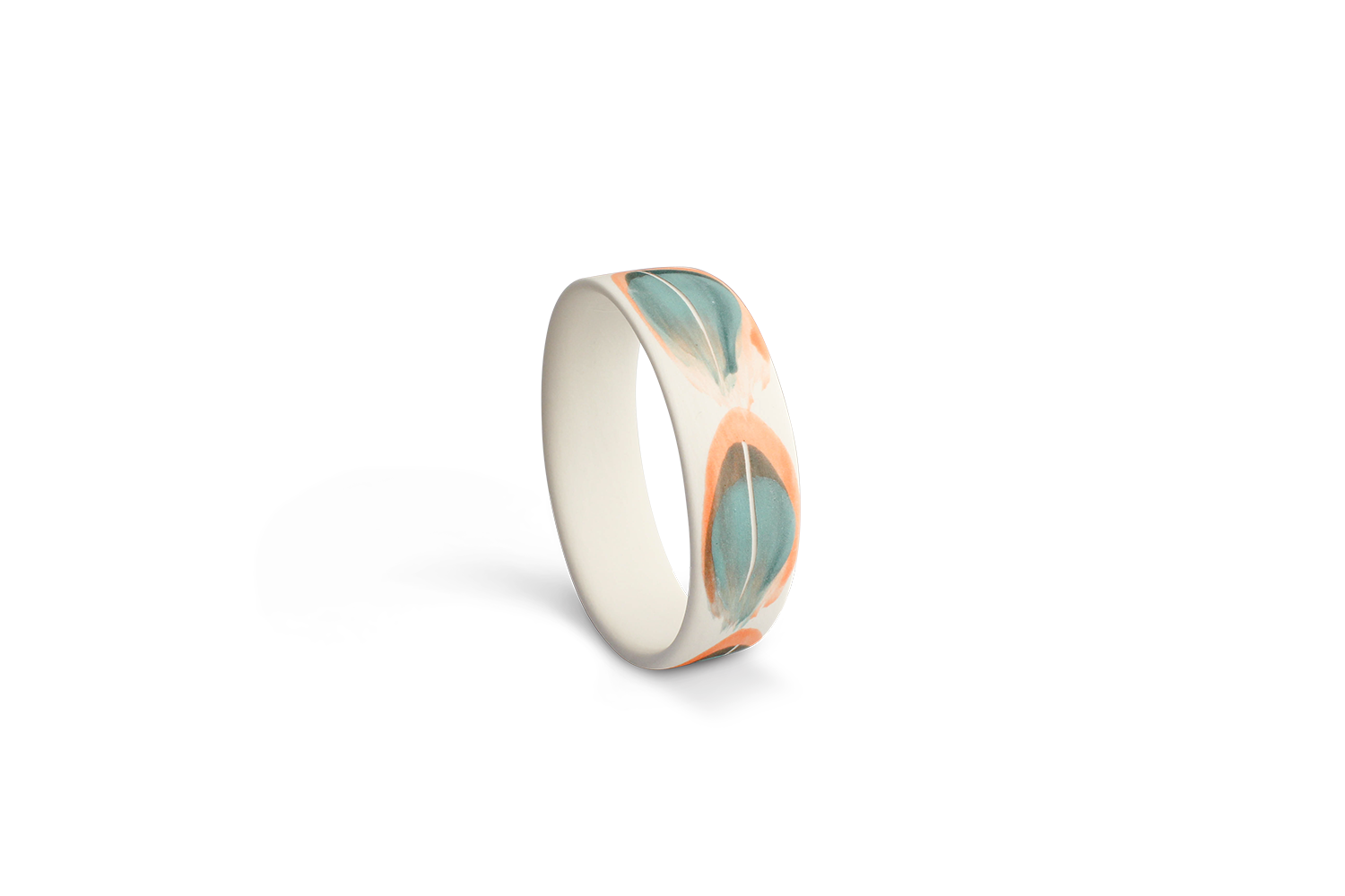 Bracelet en porcelaine non émaillé. Les motifs de feuilles oranges et turquoises sont peints à main levée. Différentes tailles sont disponibles. Série limitée