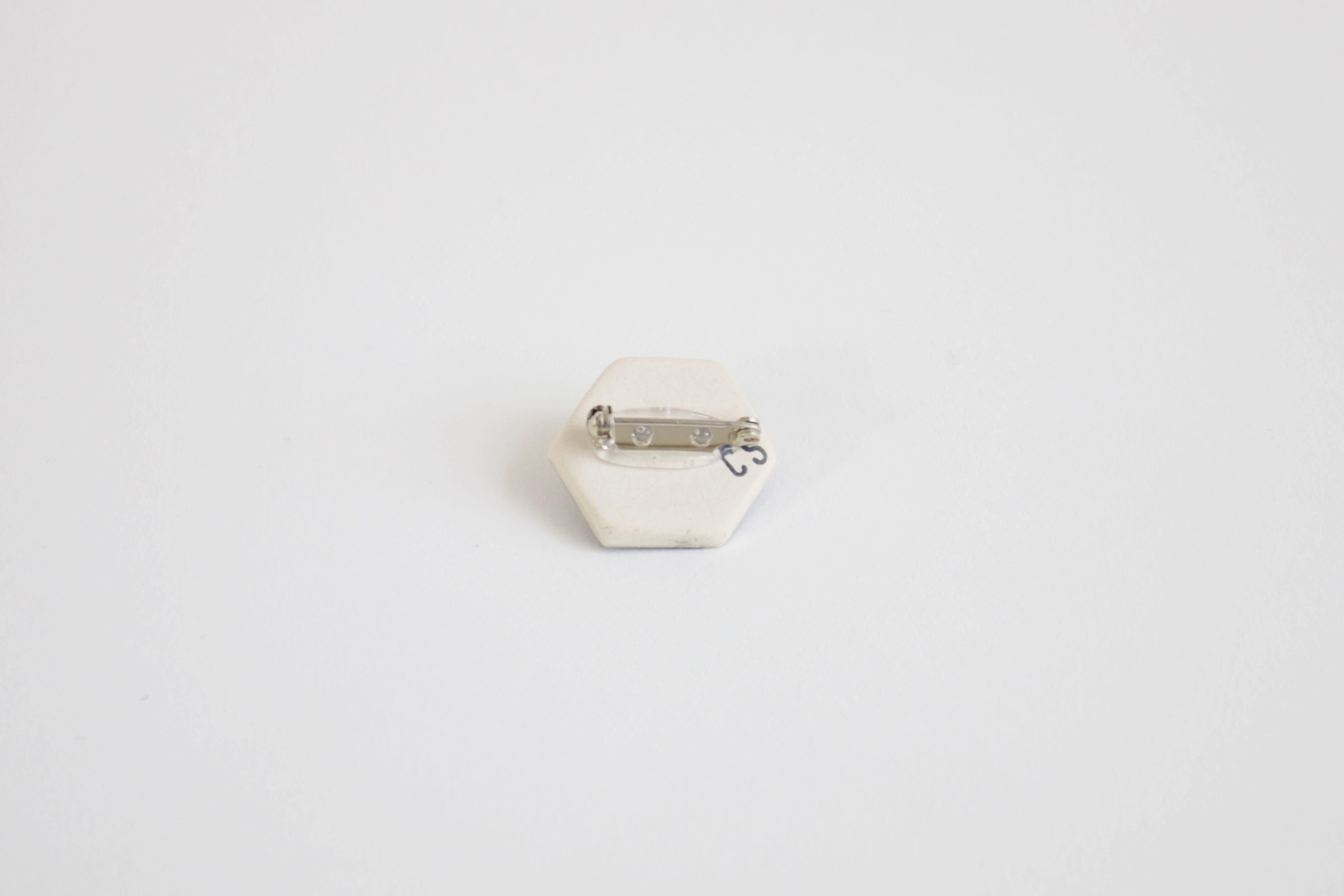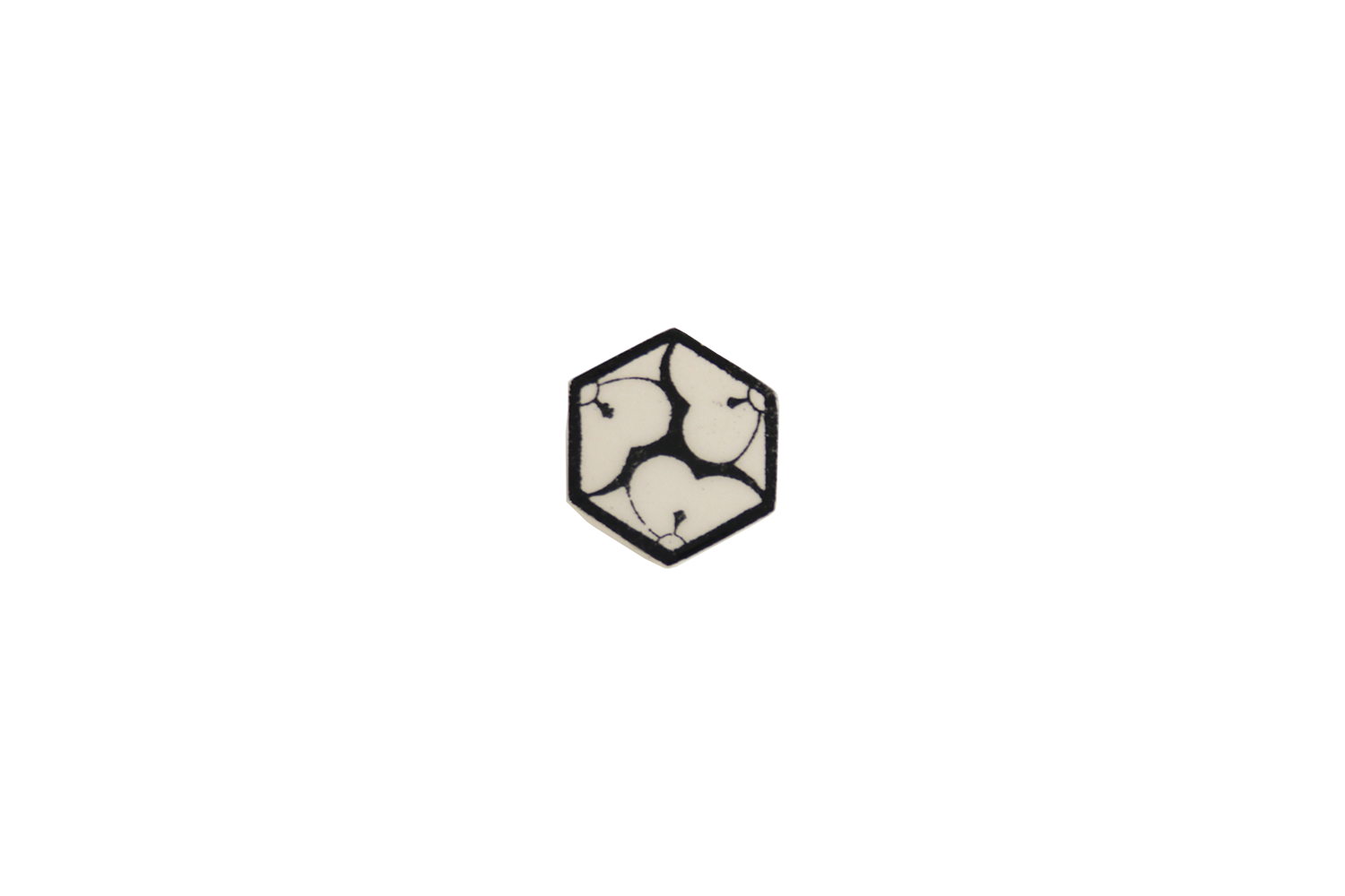 Broche en faience émaillée représentant un motif géométrique noir et blanc japonisant. Procédé d'impression de type lithographique sur terre. Fermoir aiguille sur le dos. Pièce unique