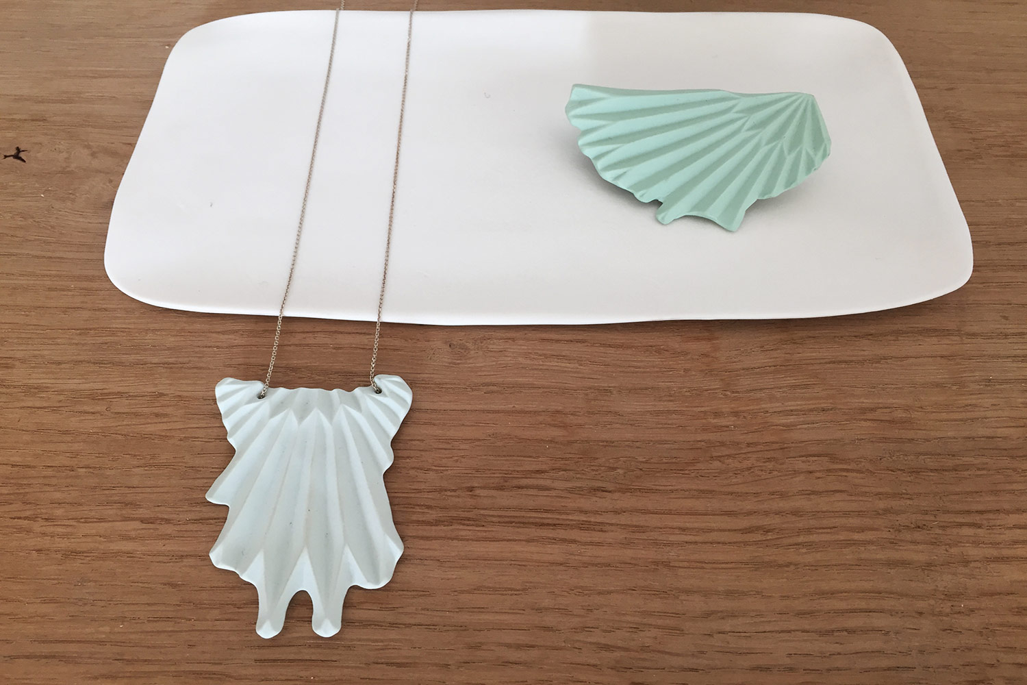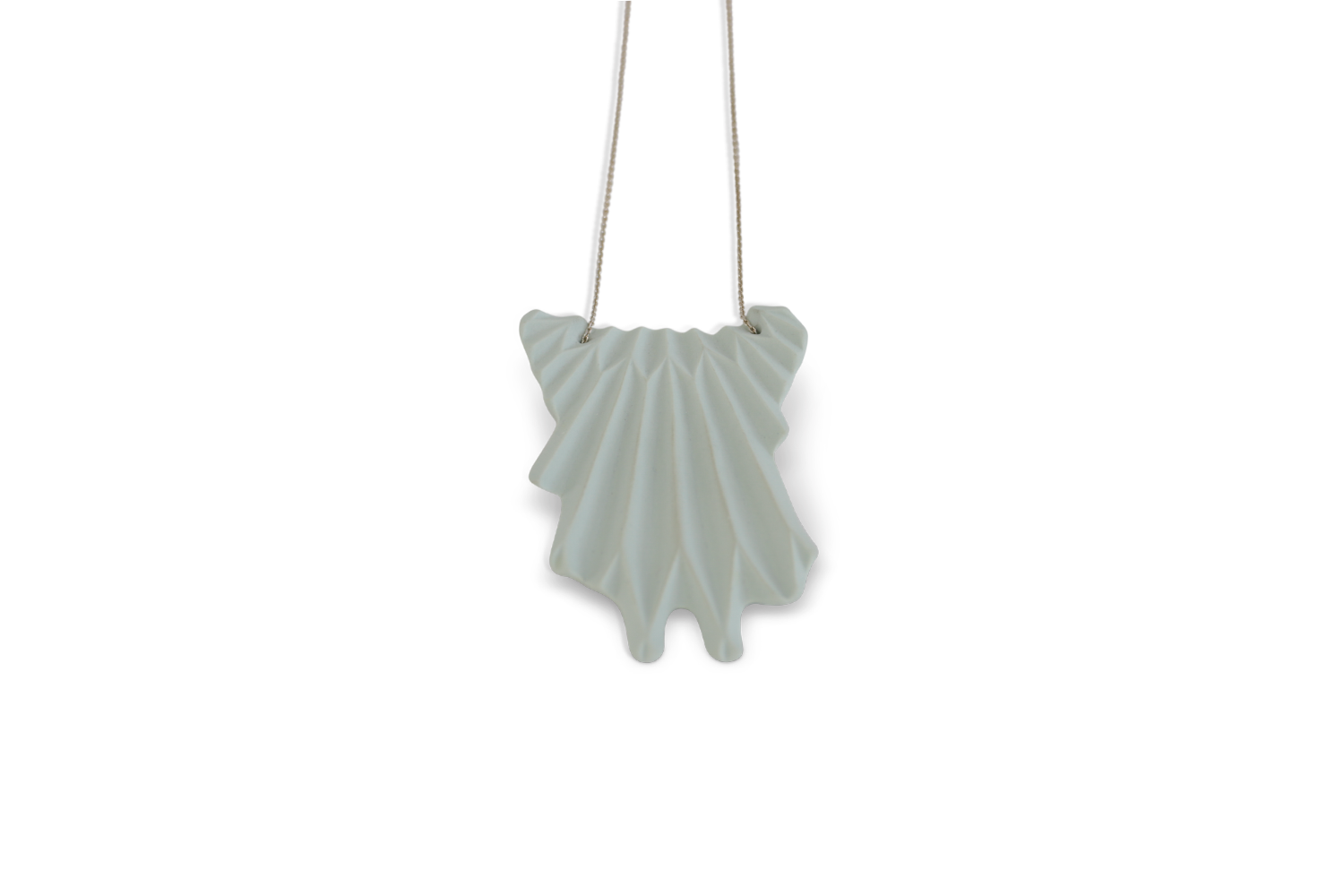 Collier en biscuit de porcelaine bleu pâle. Motif géométrique moulé dans la masse. Chaine plaquée argent. Pièce unique numérotée et gravée.