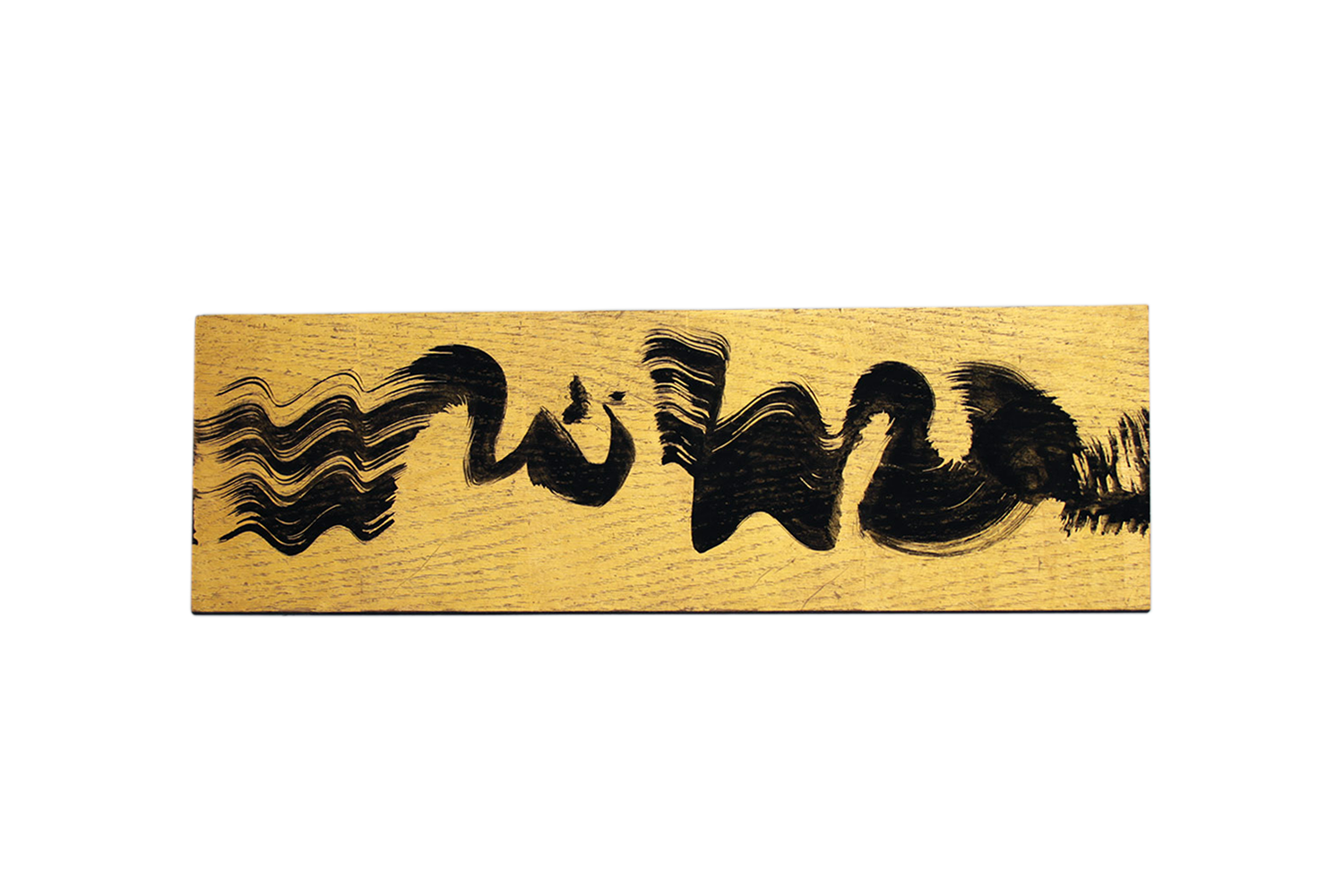 Tableau horizontal ou vertical représentant une calligraphie abstraite peinte au pinceau. Pigment noir et feuilles d'or. Pièce unique signée Dimensions : H 0,5 L 43 P 14 cm Référence : MPC-008