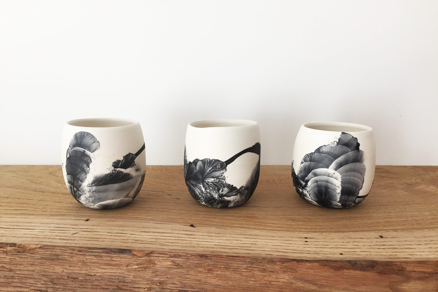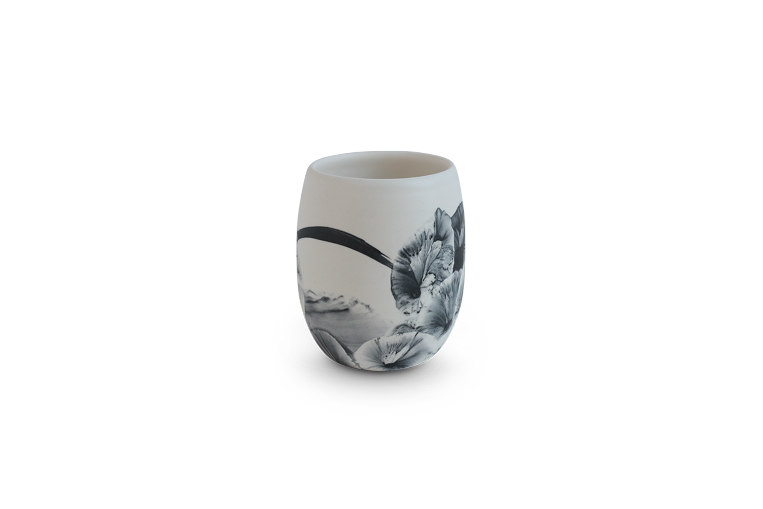 Gobelet en faience avec un paysage abstrait peint au pinceau. Email noir sur fond satiné blanc à l'extérieur et finition satinée à l'intérieur. Pièce décorative et utilitaire. Pièce unique