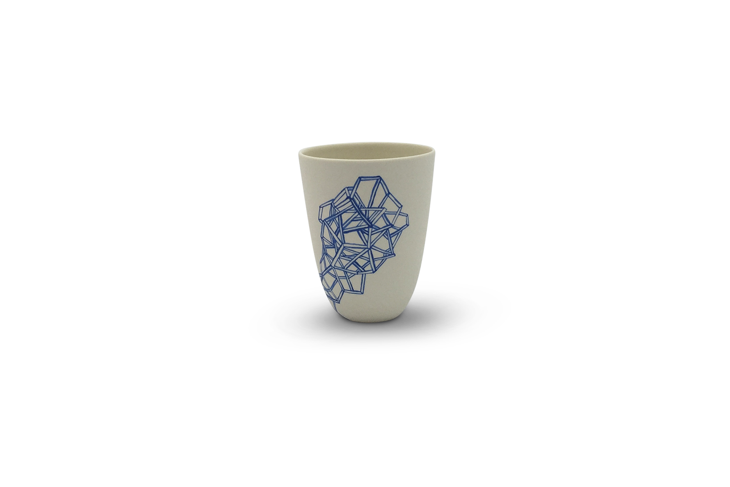 Gobelet en porcelaine de Limoges tournée. Motifs triangulaires bleus sur une face. Finition mate à l'extérieur et émail satiné à l'intérieur. Série limitée. Vaisselle utilitaire