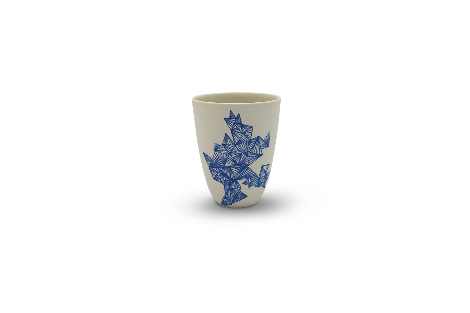 Gobelet en porcelaine de Limoges tournée. Motifs triangulaires bleus sur une face. Finition mate à l'extérieur et émail satiné à l'intérieur. Série limitée. Vaisselle utilitaire.