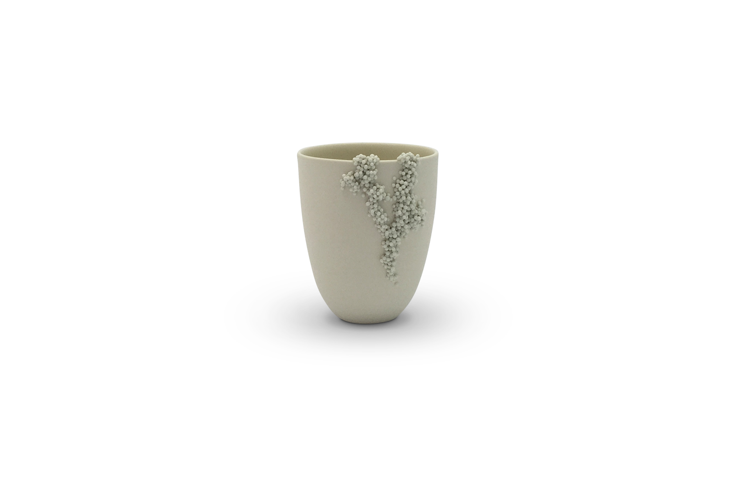 Gobelet en porcelaine de Limoges tournée. Gouttes émaillées blanches appliquées à la main. Motif partant du bord. Finition mate à l'extérieur et émail satiné à l'intérieur. Série limitée. Vaisselle utilitaire