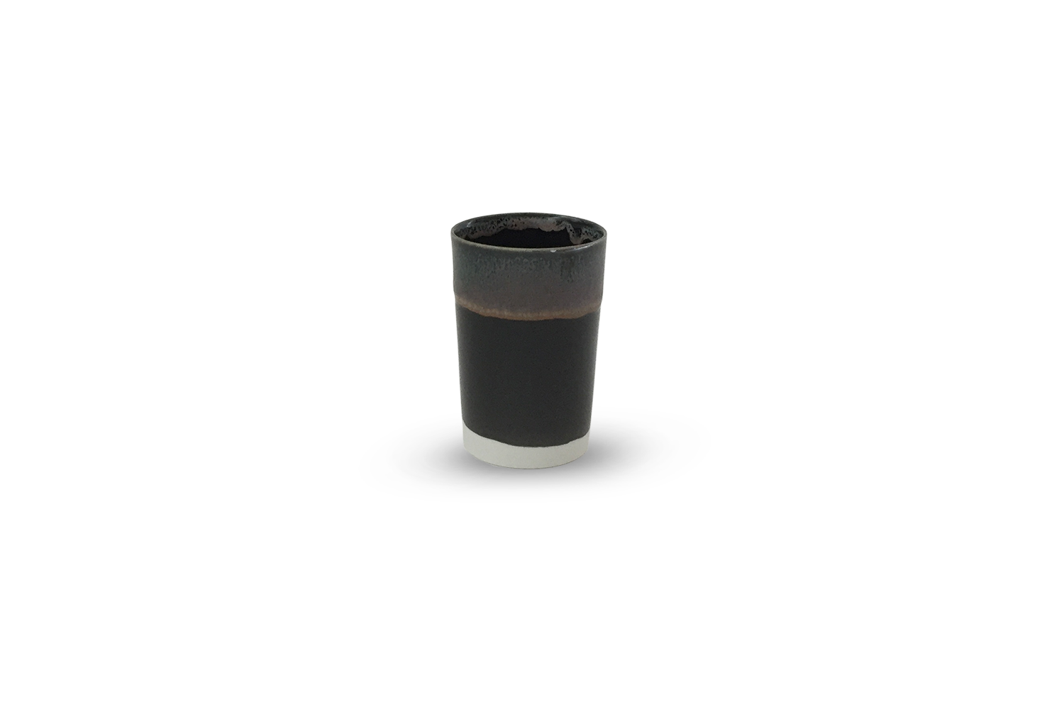 Petit gobelet étroit en porcelaine émaillée à l'extérieur et à l'intérieur de couleur noire et vert/ gris sur les bords. Finition mate sur la base. Petite série. Vaisselle utilitaire