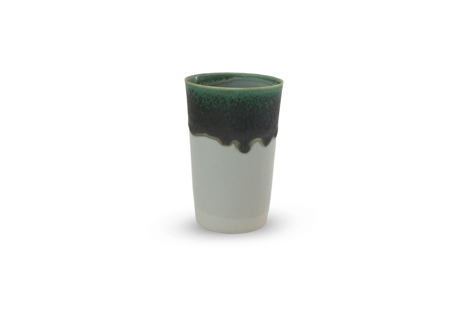 Grand gobelet étroit en porcelaine émaillée à l'extérieur et à l'intérieur de couleur bleue pale et vert/ gris sur les bords. Finition mate sur la base. Petite série. Vaisselle utilitaire