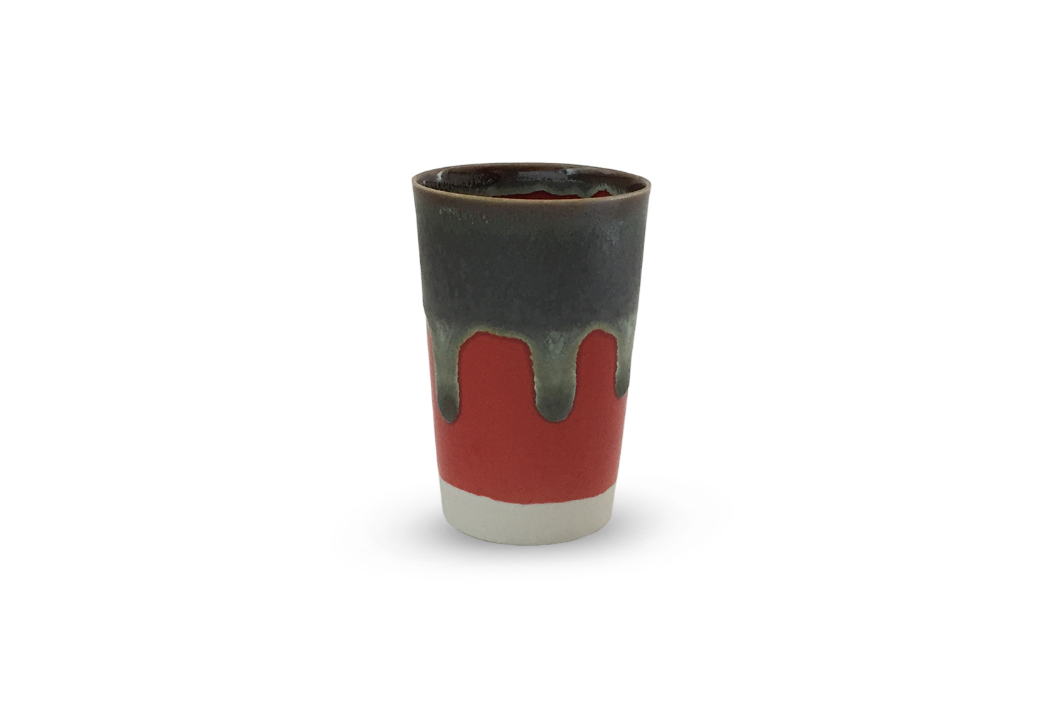 Grand gobelet étroit en porcelaine émaillée à l'extérieur et à l'intérieur de couleur rouge et vert/ gris sur les bords. Finition mate sur la base. Petite série. Vaisselle utilitaire