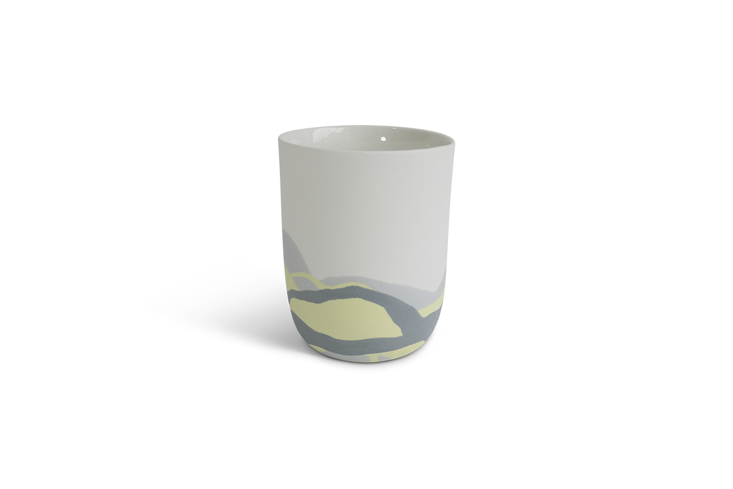 Grand mug en porcelaine avec un motif sur la base d'un paysage abstrait de couleurs gris et anis, teintées dans la masse. Surface non émaillée à l'extérieur, émaillée à l'intérieur. Céramique utilitaire. Pièce unique