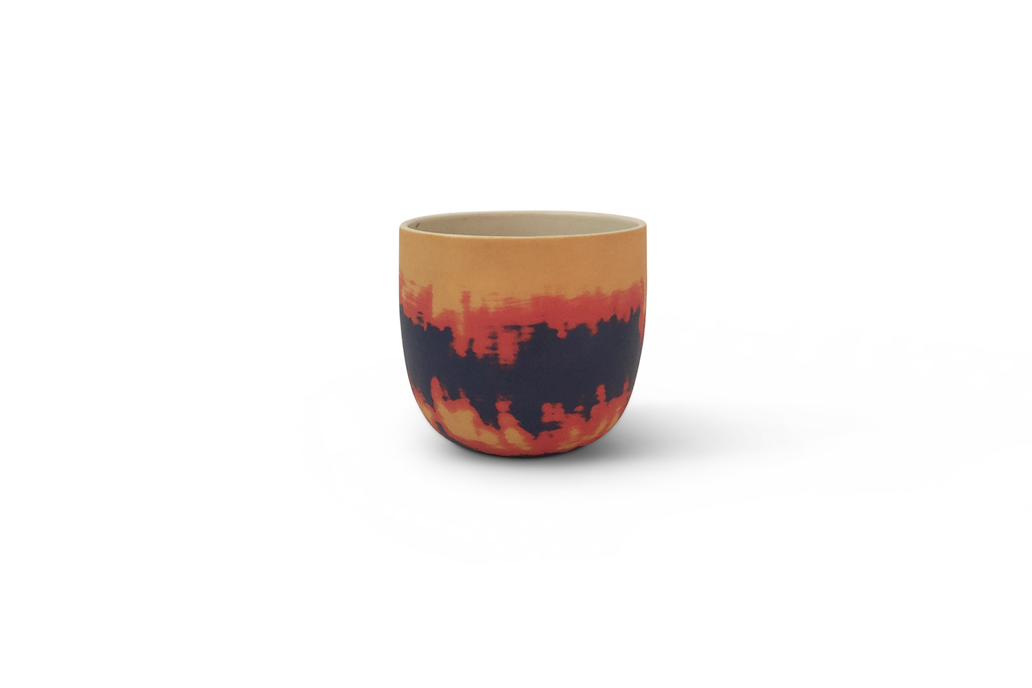 Grand bol en porcelaine au décor extérieur orange, jaune et bleu, et au décor intérieur blanc. Email satiné. Vaisselle utilitaire. Série limitée.