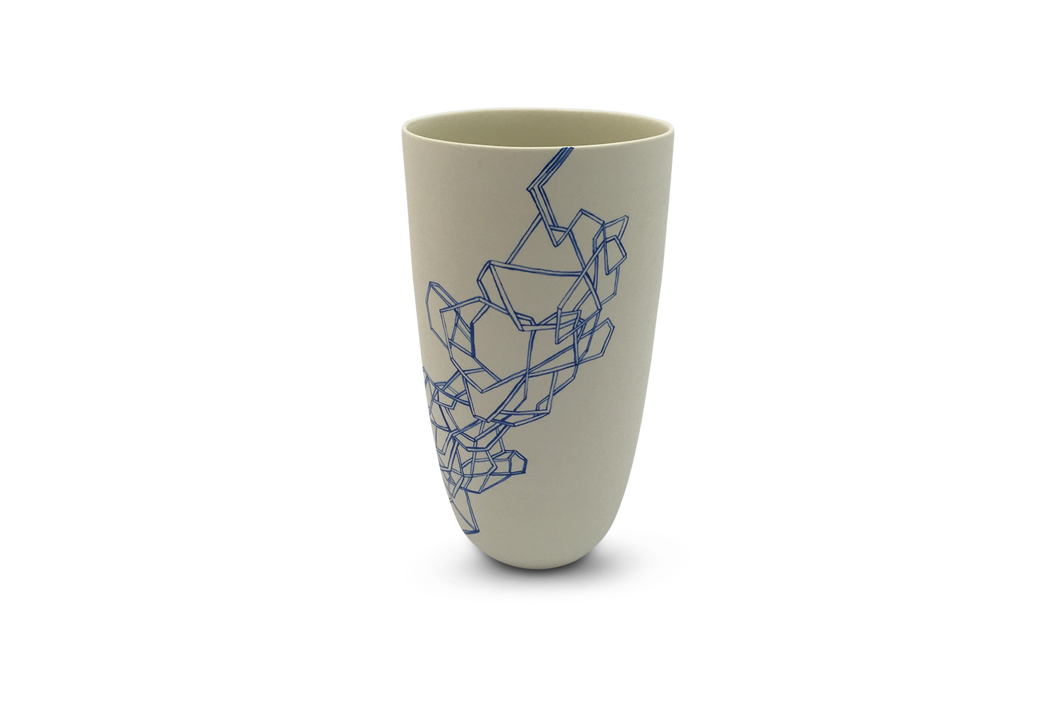 Grand vase en porcelaine de Limoges tournée. Motifs linéaires bleus sur une face. Finition mate à l'extérieur et émail satiné à l'intérieur. Série limitée. Vaisselle utilitaire