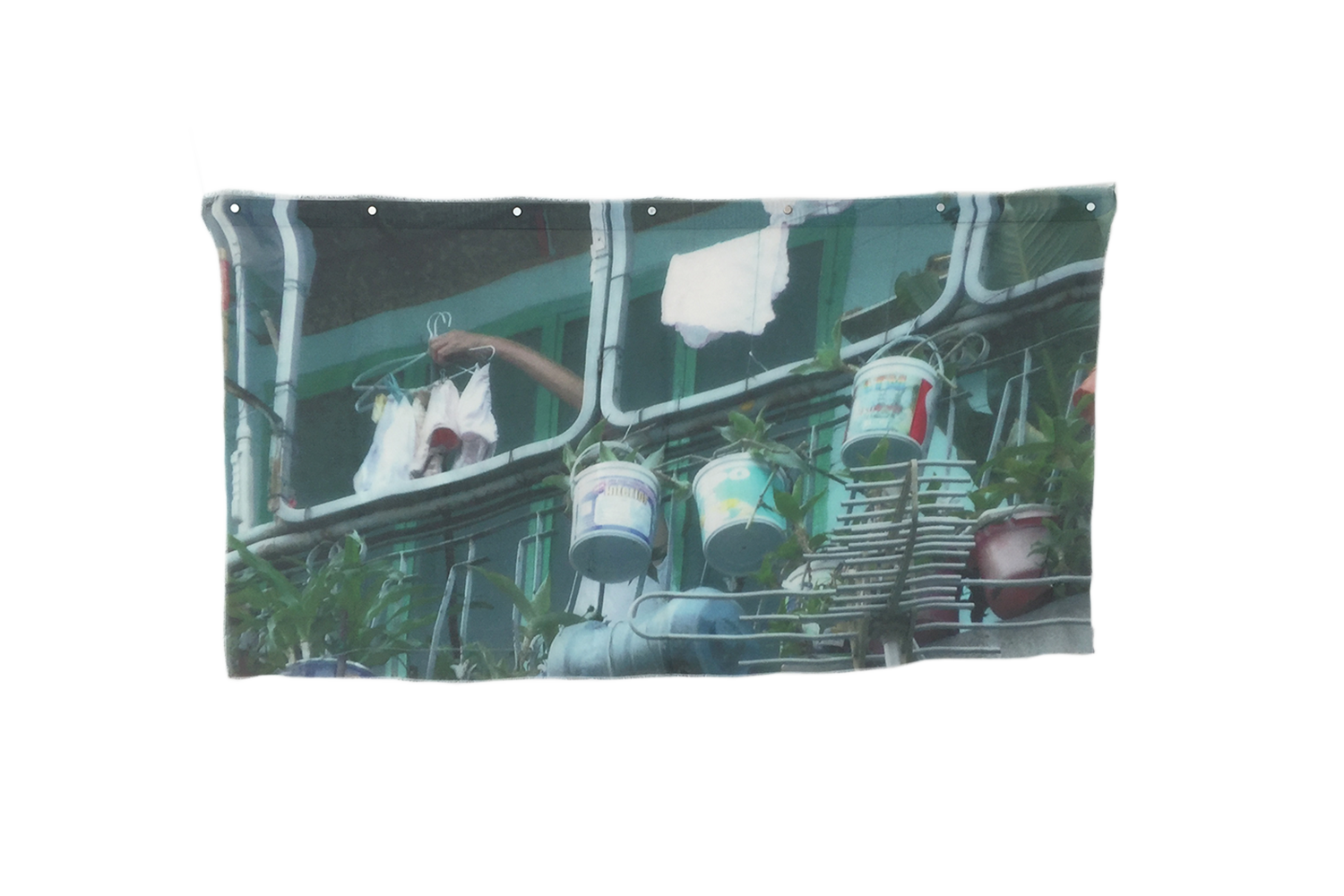 Série "La vie au balcon" Hanoi. Impression photographique sur mousseline de soie représentant une main suspendant du linge au balcon. Tenture à poser au mur. Ruban métallique avec 7 aimants fournis. Tirage limité et signé