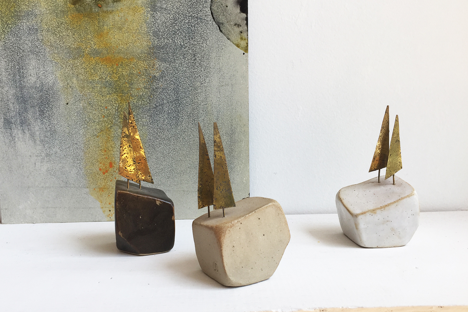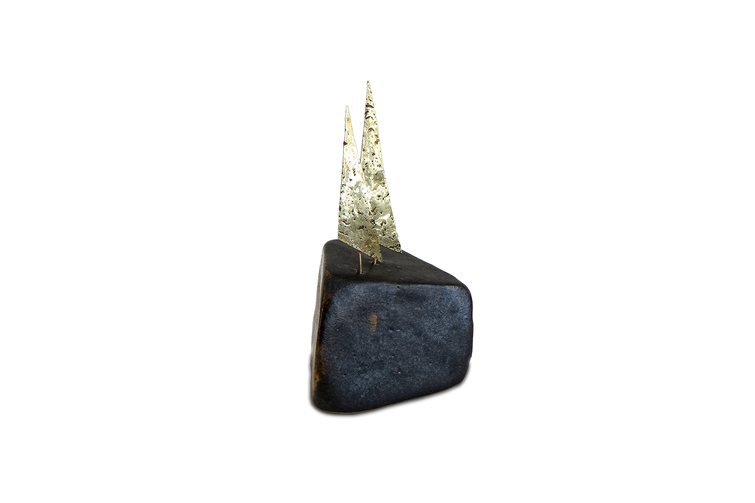Petite sculpture en grès chamotté émaillé noir avec deux sapins en laiton. Série limitée