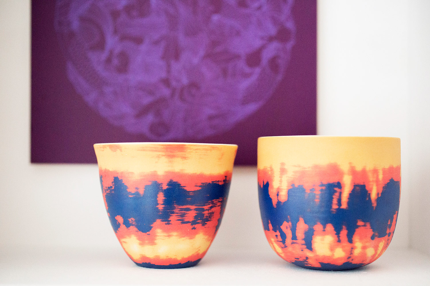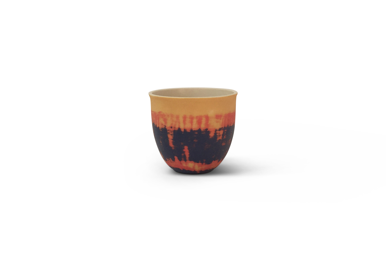 Petit bol en porcelaine au décor extérieur orange, jaune et bleu, et au décor intérieur blanc. Email satiné. Vaisselle utilitaire. Série limitée.