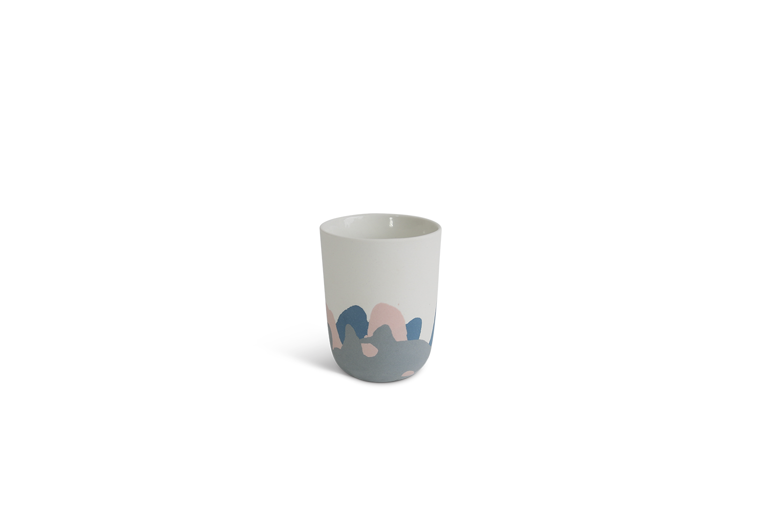 Petit mug en porcelaine avec un motif sur la base d'un paysage abstrait de couleurs bleu, gris et rose, teintées dans la masse. Surface non émaillée à l'extérieur, émaillée à l'intérieur. Céramique utilitaire. Pièce unique.