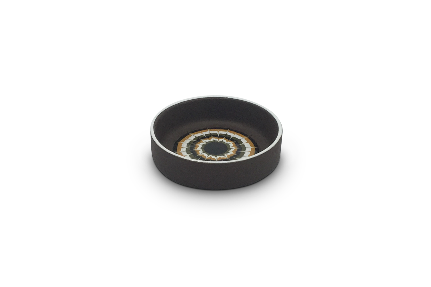 Petit vide poche en faience émaillé. Décor graphique orange, noir et blanc, émaux brillants sur émail mat marron. Hornsea pottery, céramique anglaise des années 70.