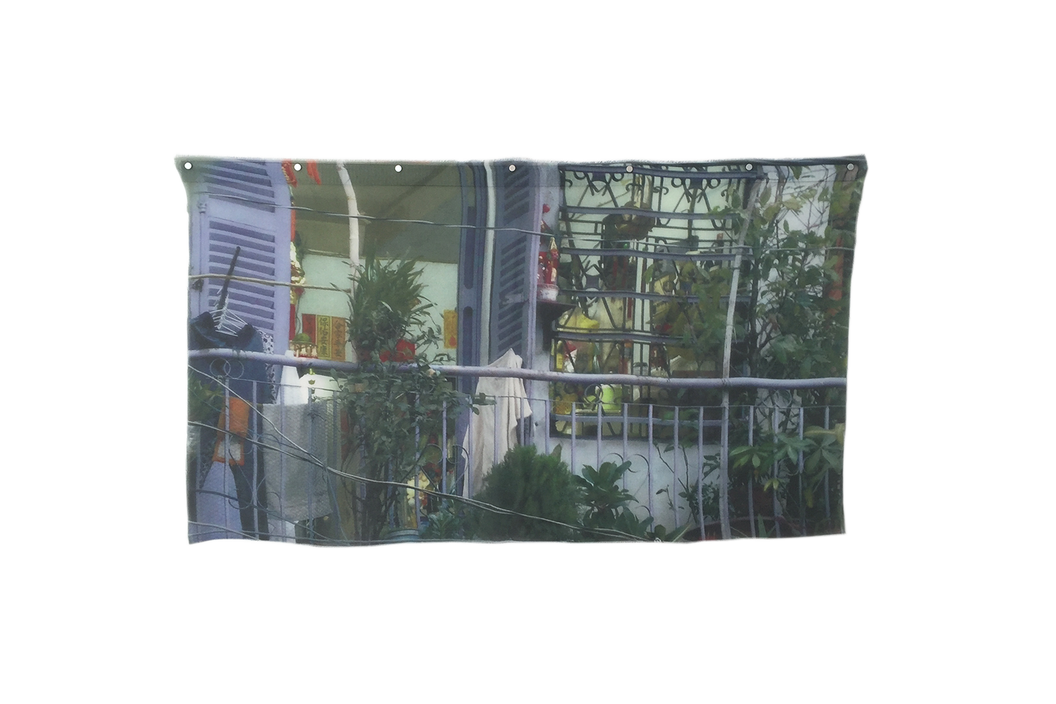 Série "La vie au balcon" Hanoi. Impression photographique sur mousseline de soie représentant des plantes sur un balcon. Tenture à poser au mur. Ruban aimanté avec 7 aimants fournis. Tirage limité et signé