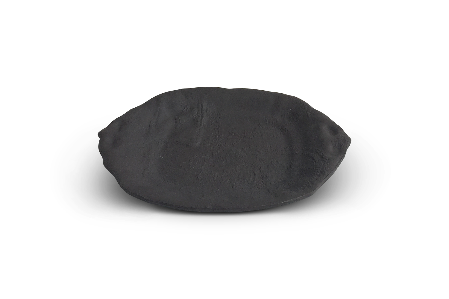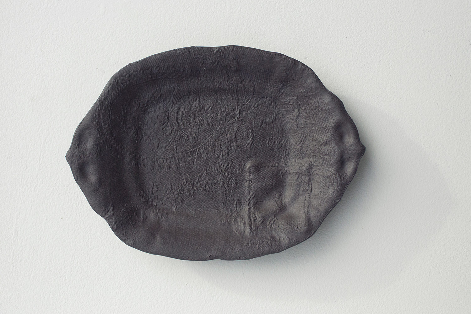 Plat de présentation en grès de la collection "From a different cloth" de couleur chocolat. Impression textile de broderie ancienne. Le motif apparaît légèrement en relief. Vaisselle utilitaire et lavable. Petite série