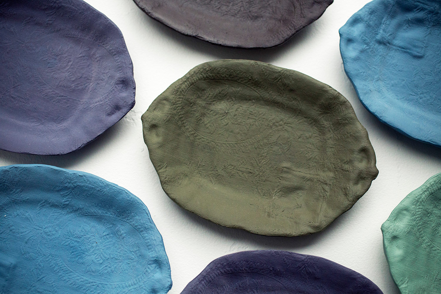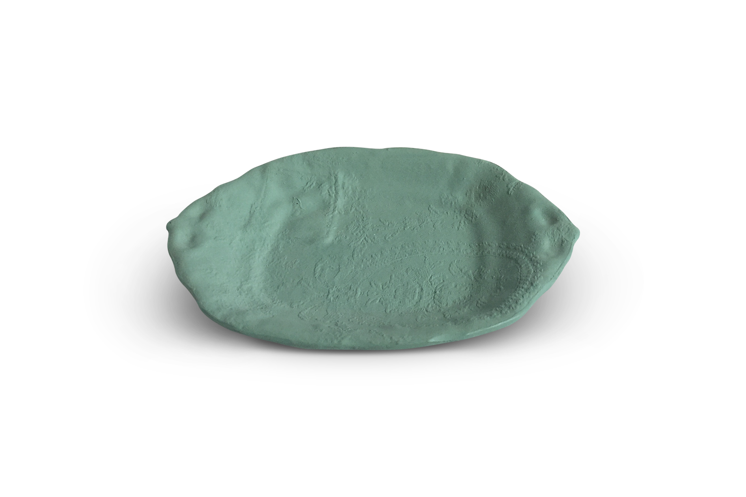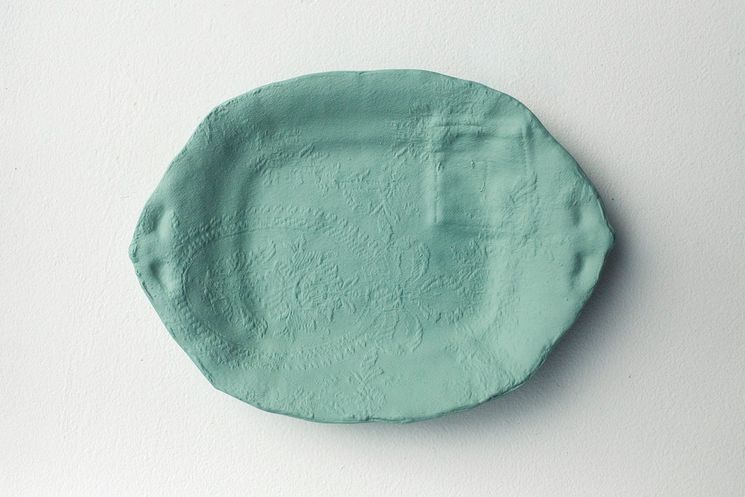 Plat de présentation en grès de la collection "From a different cloth" de couleur vert céladon. Impression textile de broderie ancienne. Le motif apparaît légèrement en relief. Vaisselle lavable utilitaire ou décorative. Petite série