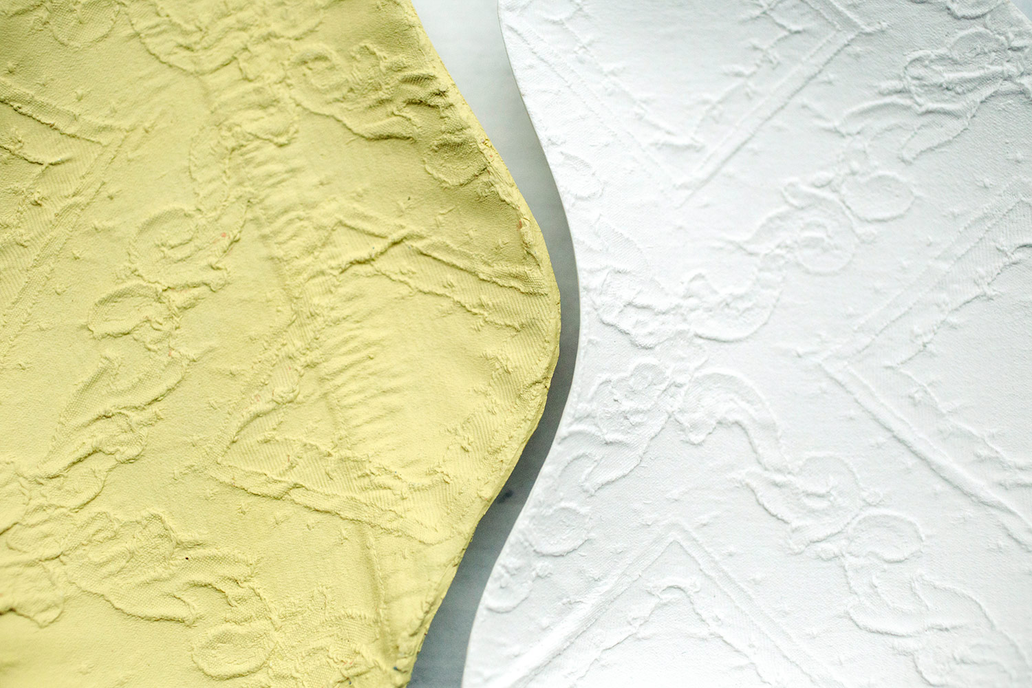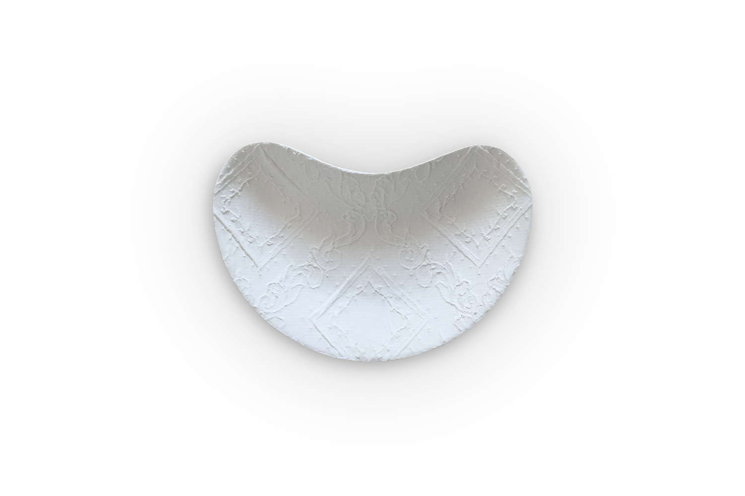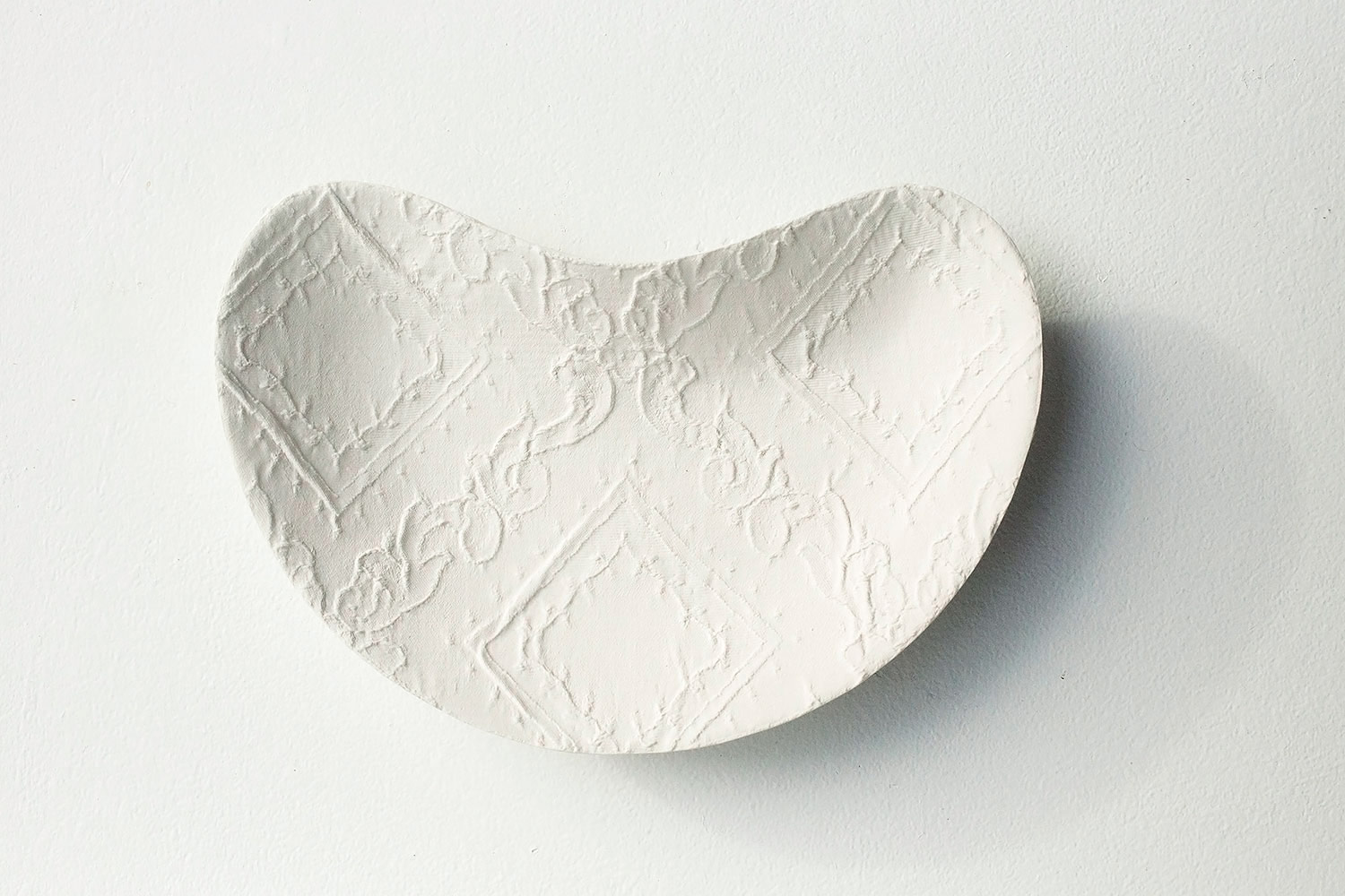 Plat de présentation en grès de la collection "From a different cloth". Forme haricot. Impression textile de broderie ancienne. Le motif apparaît légèrement en relief. Vaisselle lavable utilitaire ou décorative. Petite série.