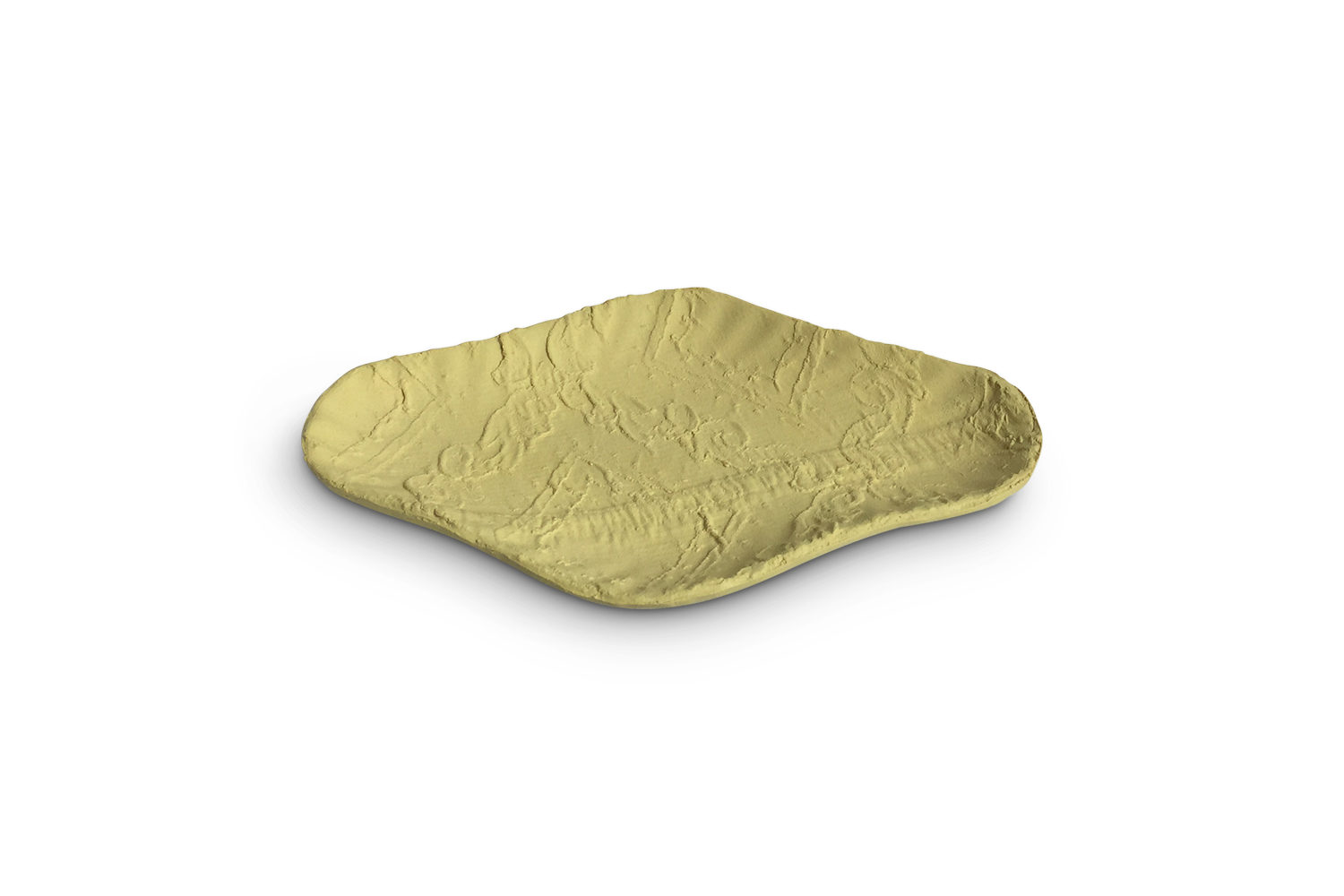 Plat de présentation en grès de la collection "From a different cloth"de couleur jaune anis. Forme losange. Impression textile de broderie ancienne. Les motifs apparaissent légèrement en relief. Vaisselle lavable utilitaire ou décorative. Petite série.