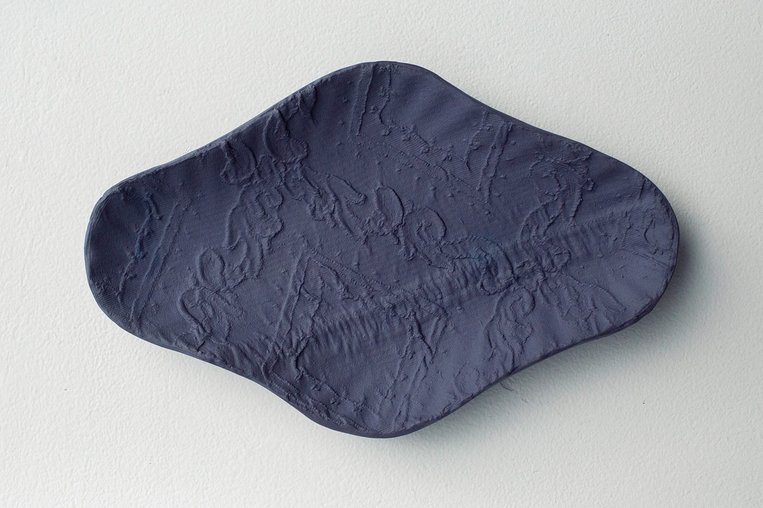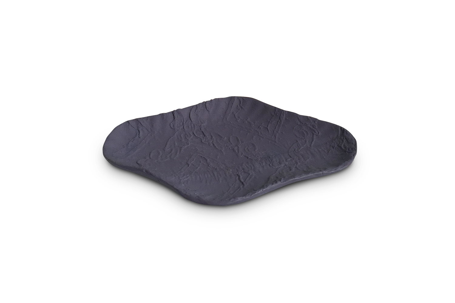 Plat de présentation en grès de la collection "From a different cloth" de couleur violette. Forme losange. Impression textile de broderie ancienne. Le motif apparaît légèrement en relief. Vaisselle lavable utilitaire ou décorative. Petite série