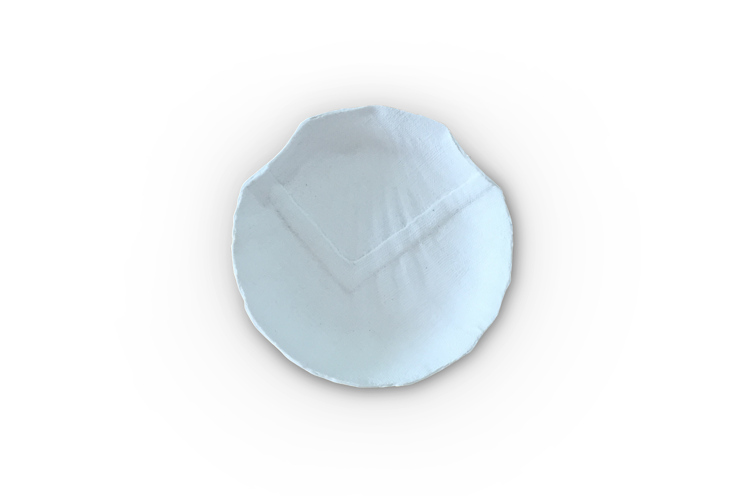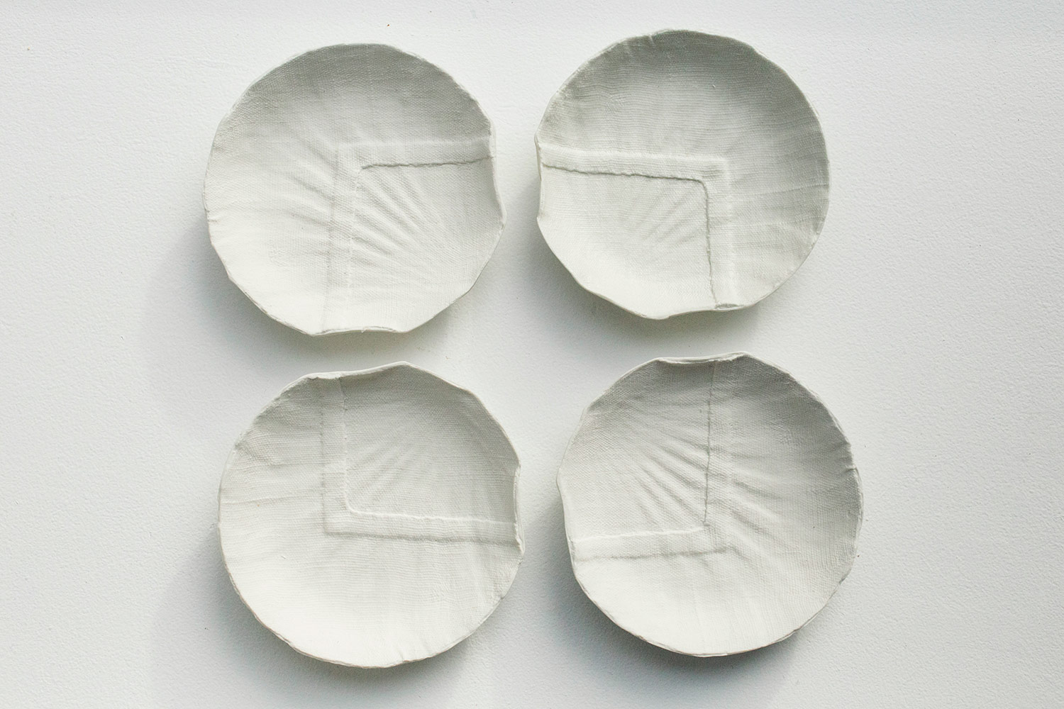 Ramequin blanc en grès de la collection "From a different cloth". Impression textile d'un drap de lin avec sa trame et sa ligne de couture surpiquée. Le motif apparaît légèrement en relief. Vaisselle lavable utilitaire ou décorative. Petite série.