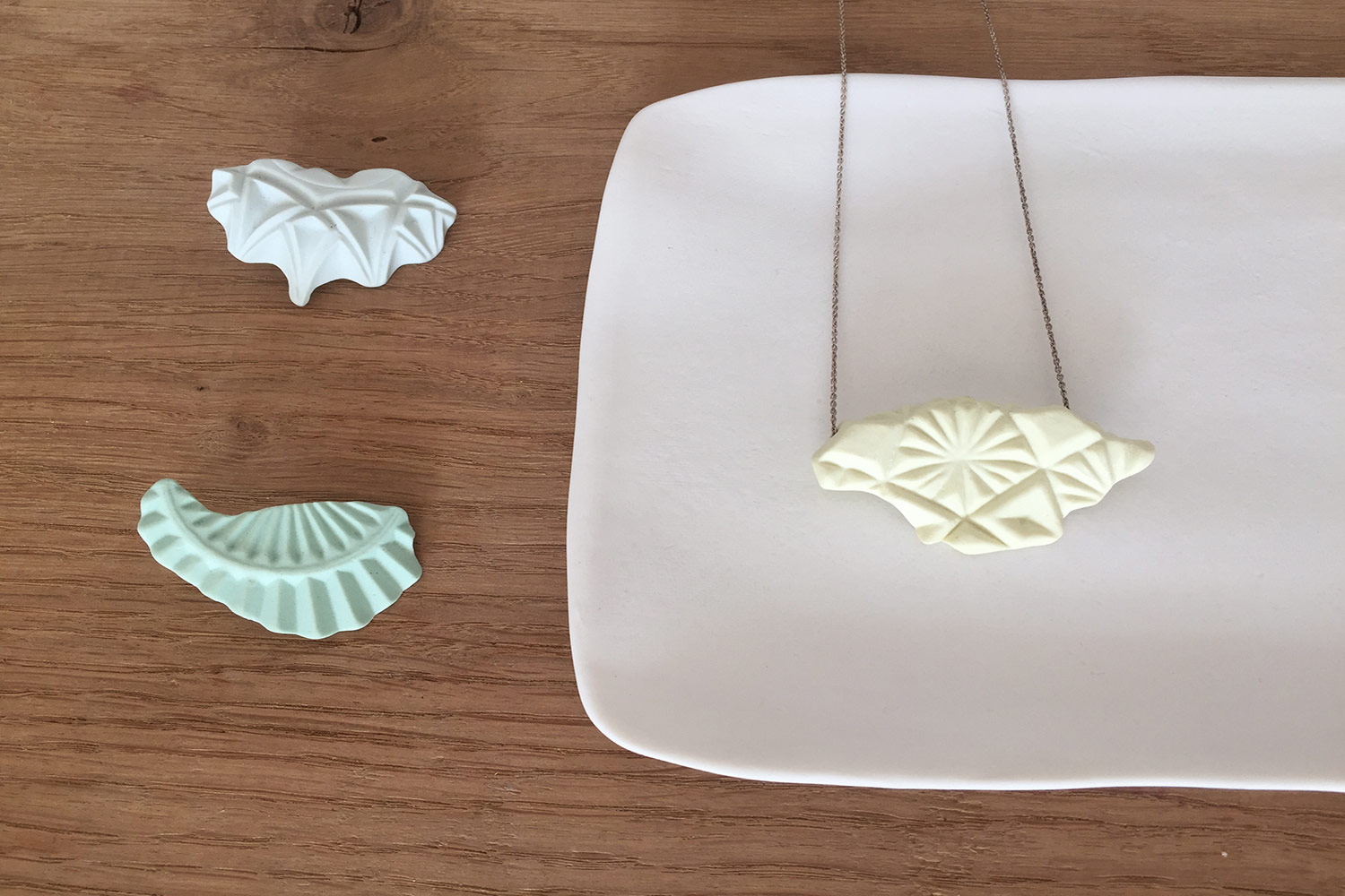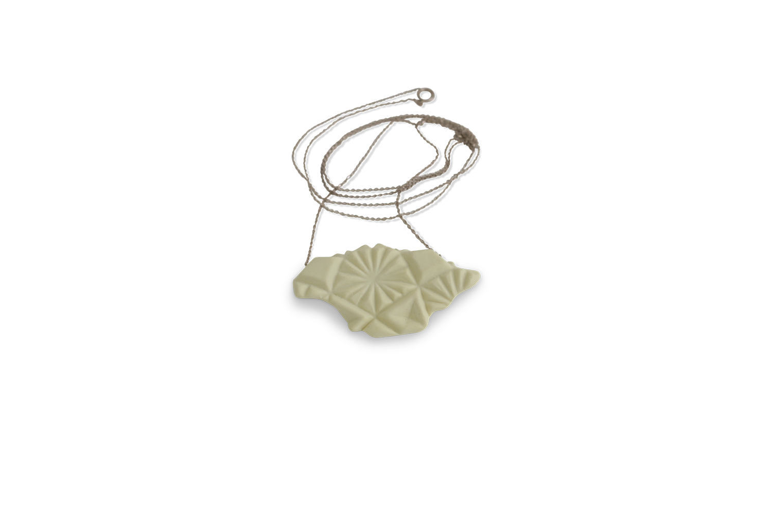 Sautoir en biscuit de porcelaine jaune pâle. Motif géométrique moulé dans la masse. Chaine plaquée argent. Pièce unique numérotée et gravée.