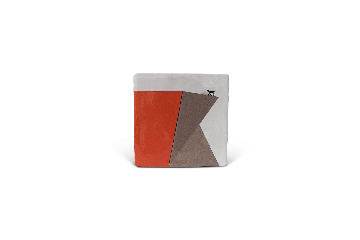 Carreau de faience à suspendre. Petit chien dans un paysage de motifs géométriques. Transfert de collage photo et motifs peints. Suspension métallique intégrée au dos