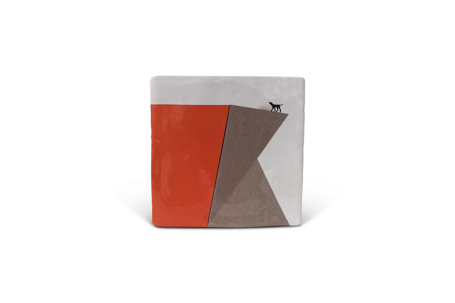 Carreau de faience à suspendre. Petit chien dans un paysage de motifs géométriques. Transfert de collage photo et motifs peints. Suspension métallique intégrée au dos
