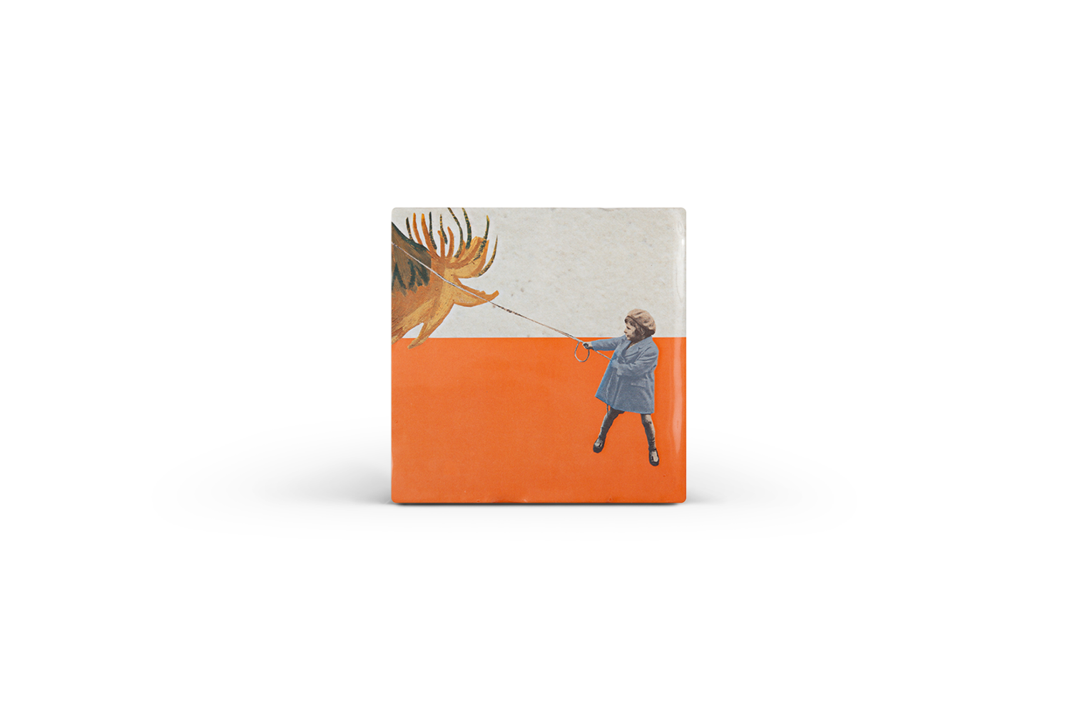 Carreau de faience à suspendre. Petite fille tirant sur une fleur attachée à un fil. Transfert de collage photo et de motifs peints. Suspension métallique intégrée au dos