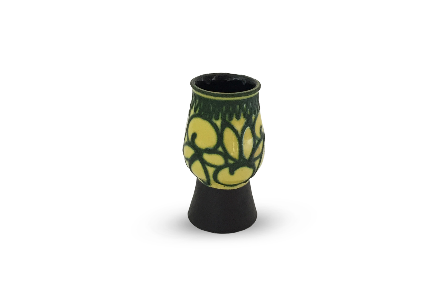 Petit vase sur pied. Décor végétal noir en relief sur émail brillant jaune. Studio de Stehla, Allemagne de l'Est, 1970. Dimensions : H 15 L 9 P 9 cm Référence : VAL-001